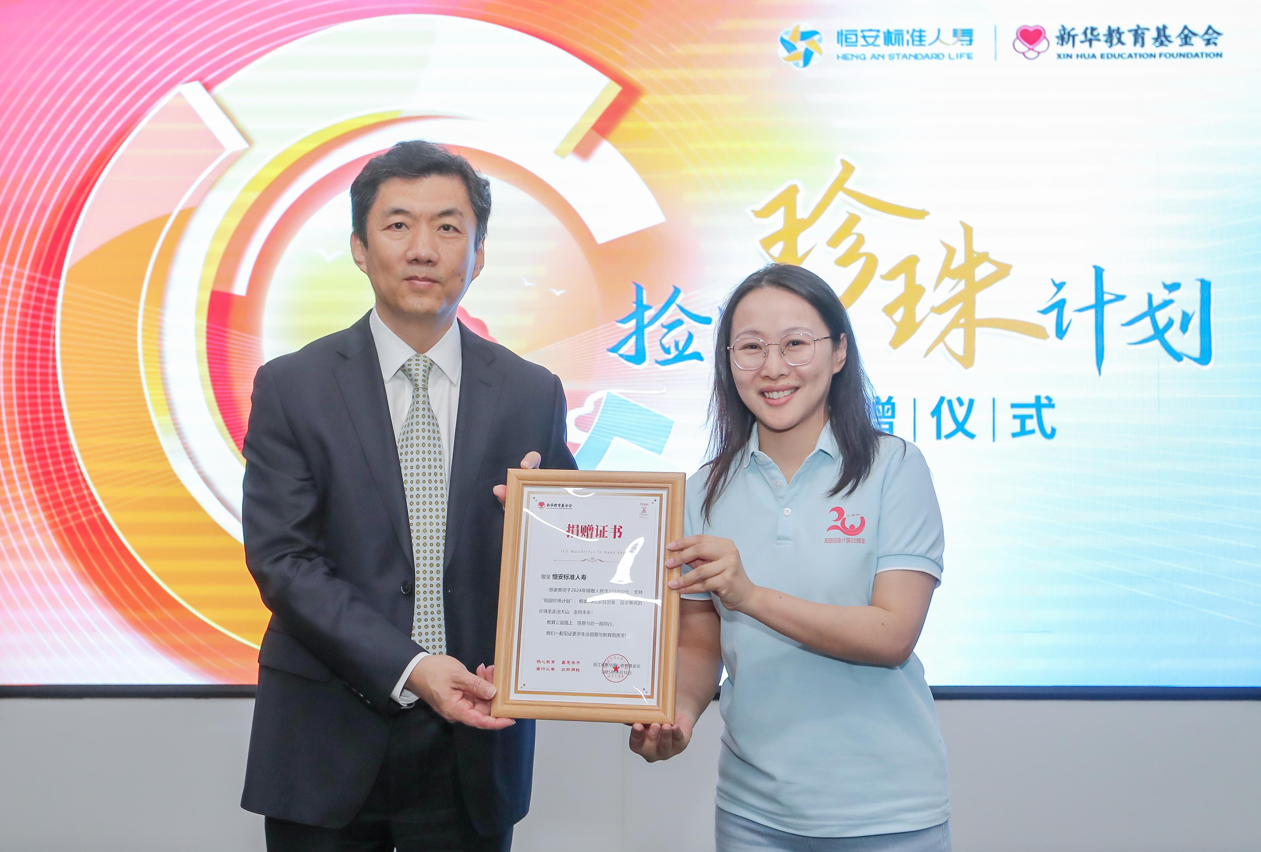 近日,恒安標準人壽“撿回珍珠計劃”捐贈儀式在天津舉辦。恒安標準人壽副總經(jīng)理朱路代表公司向新華教育基金會(huì )“撿回珍珠計劃”捐贈225000元,支持在貴州省開(kāi)陽(yáng)縣第三中學(xué)開(kāi)設“恒安標準人壽珍珠班”并為30名學(xué)生提供教育資助。新華教育基金會(huì )副秘書(shū)長(cháng)王涵,恒安標準人壽相關(guān)負責人和全國營(yíng)銷(xiāo)伙伴通過(guò)現場(chǎng)和在線(xiàn)收看的方式共同見(jiàn)證此次捐贈。