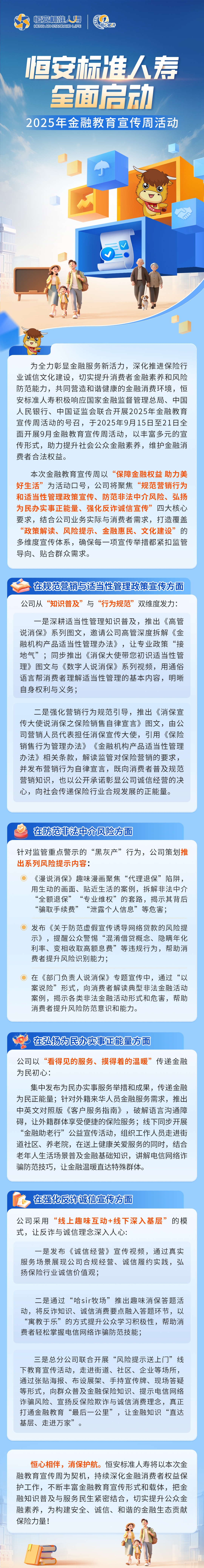本次金融教育宣傳周以“保障金融權益 助力美好生活”為活動(dòng)口號,公司將聚焦“規范營(yíng)銷(xiāo)行為和適當性管理政策宣傳、防范非法中介風(fēng)險、弘揚為民辦實(shí)事正能量、強化反詐誠信宣傳”四大核心要求,結合公司業(yè)務(wù)實(shí)際與消費者需求,打造覆蓋“政策解讀、風(fēng)險提示、金融惠民、文化建設”的多維度宣傳體系,確保每一項宣傳舉措都緊扣監管導向、貼合群眾需求。